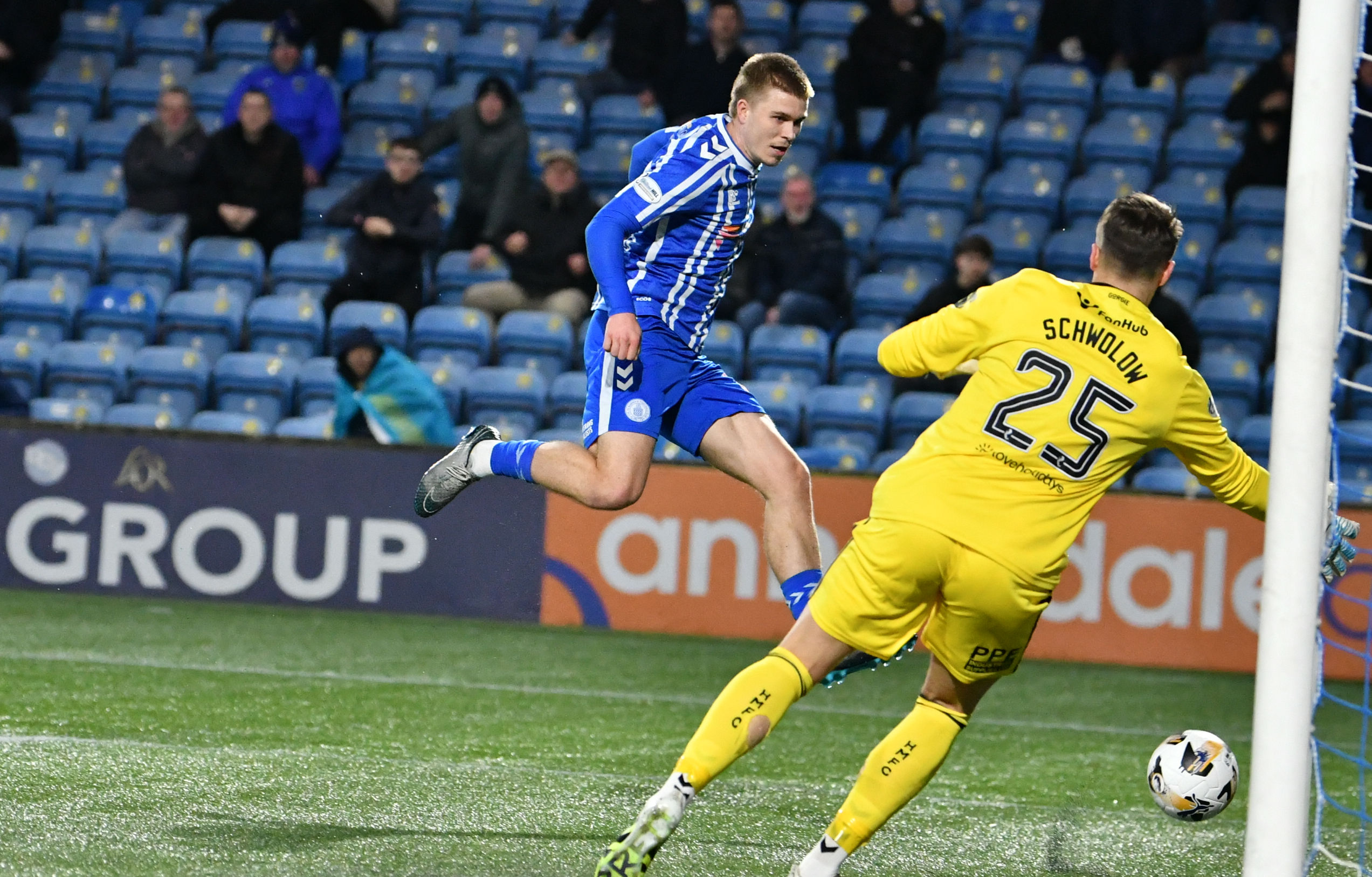 After a stoppage for a head knock following a hefty challenge on Tshibola, Killie were next to go close. This time Joe Hugilll saw his effort saved by Schwolow. Curtis showed great feet shortly before half-time before unleashing a thunderous effort from the left flank, but the shot was held.